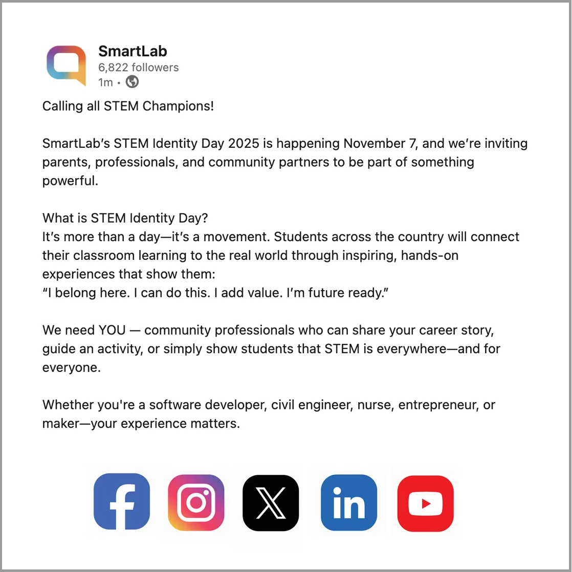 Student engagement is at levels I have never seen in my 23 years of teaching. Students love the lab and are constantly asking if they can come down in their free time to continue working with Ukits, or Engino, etc. I’ve never been busier as a teacher, but also have never had more fun. It’s encouraged me to gladly take work home and get more proficient in areas such as coding and circuitry. I see myself as a lifelong learner, and this lab not only meets the needs of my students but also fulfills my own growth as a facilitator and person. I appreciate my administration for investing in this lab and appreciate SmartLab for offering such an incredible product!!!